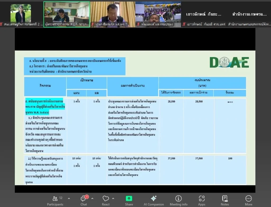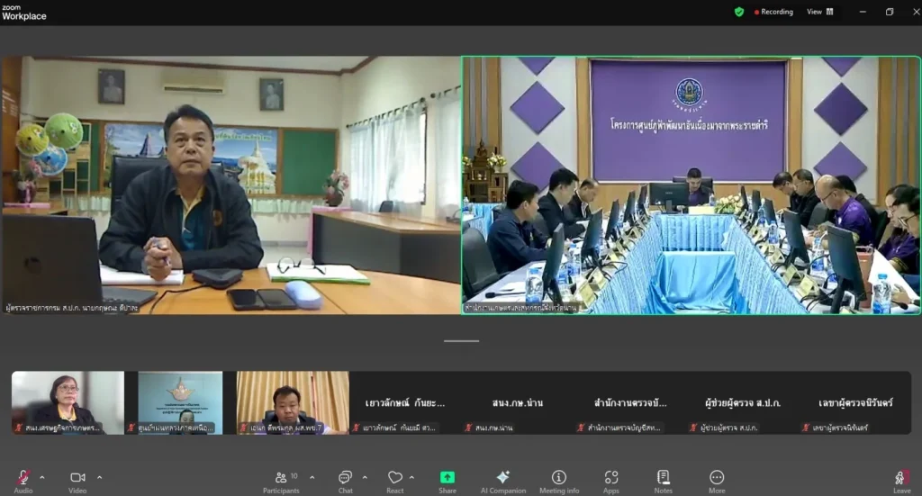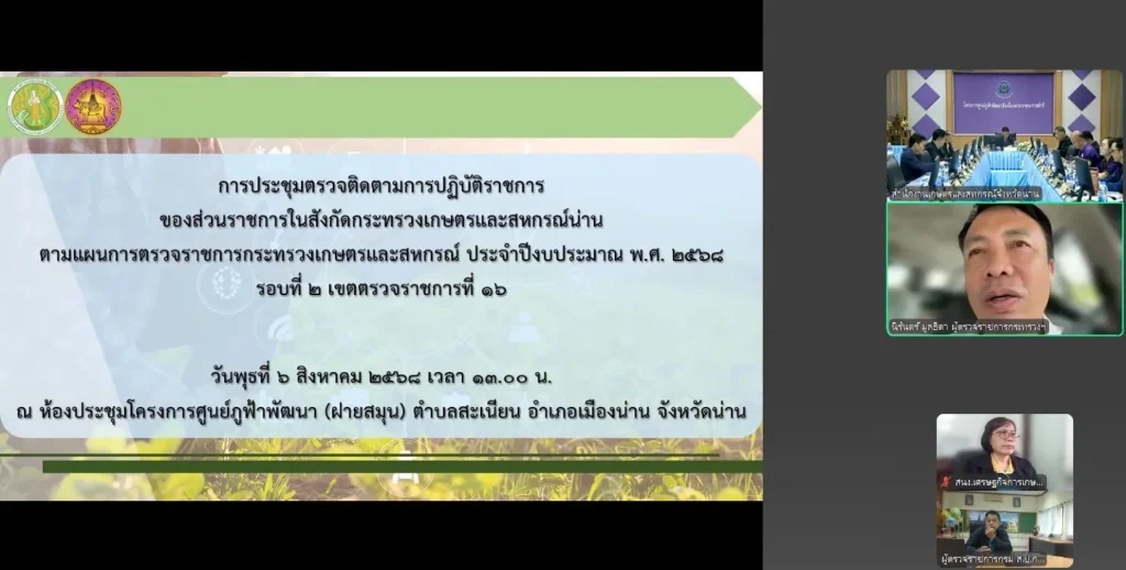 วันที่ 6 สิงหาคม 2568 นางธัญญ์พิชชา เถระรัชชานนท์ ผู้อำนวยการสำนักงานเศรษฐกิจการเกษตรที่ 2 (ผอ.สศท.2 พิษณุโลก) มอบหมายให้นางสุธาทิพย์ ศรีสรรพกิจ ผู้อำนวยการส่วนแผนพัฒนาเขตเศรษฐกิจการเกษตร เข้าร่วมประชุมตรวจติดตามผลการดำเนินงานตามแผนการตรวจราชการของผู้ตรวจราชการ กษ.เขตตรวจราชการที่ 16 จังหวัดน่าน ประจำปีงบประมาณ พ.ศ.2568 รอบที่ 2 ผ่านระบบออนไลน์ Zoom โดยมี นายนิรันดร์ มูลธิดา ผู้ตรวจราชการกระทรวงเกษตรและสหกรณ์ เขตตรวจราชการที่ 16 เป็นประธานการประชุม