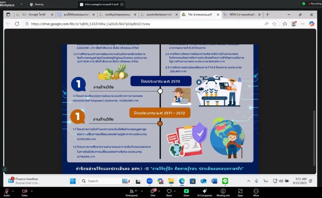 วันที่ 25 กันยายน 2568 นางธัญญ์พิชชา เถระรัชชานนท์ ผู้อำนวยการสำนักงานเศรษฐกิจการเกษตรที่ 2 (ผอ.สศท.2 พิษณุโลก) มอบหมายให้นายวาริท ชูสกุล ผู้อำนวยการส่วนวิจัยและประเมินผล พร้อมด้วยนายธนากร แก้วจรูญ เศรษฐกรชำนาญการ เข้าร่วมประชุมคณะอนุกรรมการพัฒนางานด้านวิจัยเศรษฐกิจการเกษตรและติดตามประเมินผล ครั้งที่ 4/2568 เพื่อพิจารณาผลการศึกษางานวิจัยบูรณาการ เรื่อง การศึกษาต้นทุนส่วนเพิ่มการลดก๊าซเรือนกระจก สินค้าพืชเศรษฐกิจ สินค้าข้าวนาปี ข้าวโพดเลี้ยงสัตว์ และปาล์มน้ำมัน ก่อนส่งเอกสารงานวิจัย (Final Report) ผ่านระบบออนไลน์ zoom meeting โดยมี นางสาวนริศรา เอี่ยมคุ้ย ผู้อำนวยการสำนักงานเศรษฐกิจการเกษตรที่ 6 เป็นประธานการประชุมในครั้งนี้