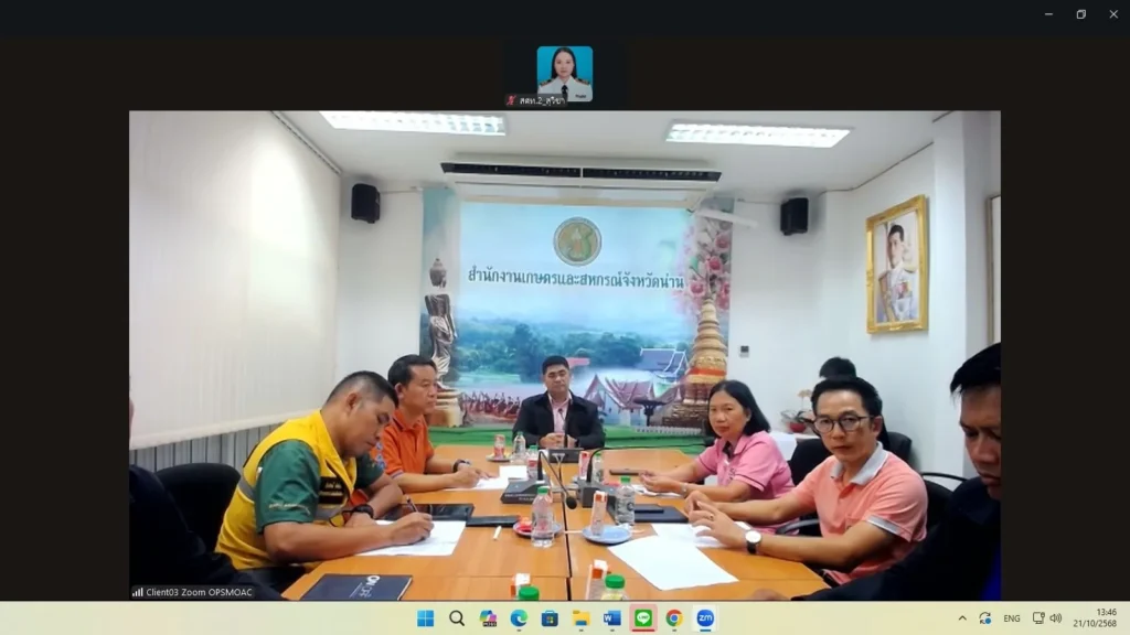 วันที่ 21 ตุลาคม 2568 นางธัญญ์พิชชา เถระรัชชานนท์ ผู้อำนวยการสำนักงานเศรษฐกิจการเกษตรที่ 2 (ผอ.สศท.2 พิษณุโลก) มอบหมายให้ นางสาวปานรดา ถาเรือน นักวิเคราะห์นโยบายและแผนชำนาญการพิเศษ รักษาการในตำแหน่ง ผู้อำนวยการส่วนสารสนเทศการเกษตร พร้อมด้วย นางสุวิชา กิจวรรณ เจ้าพนักงานสถิติปฏิบัติงาน เข้าร่วมประชุมคณะกรรมการศูนย์ติดตามและแก้ไขปัญหาภัยพิบัติด้านการเกษตรจังหวัดน่าน ณ ห้องประชุมสำนักงานเกษตรและสหกรณ์จังหวัดน่าน ชั้น 4 ศาลากลางจังหวัดน่าน ผ่านการประชุมทางไกล แอปพลิเคชั่น Zoom Cloud Meeting โดยมี นายกฤษณ อำพันธุ์ เกษตรและสหกรณ์จังหวัดน่าน เป็นประธานในการประชุม