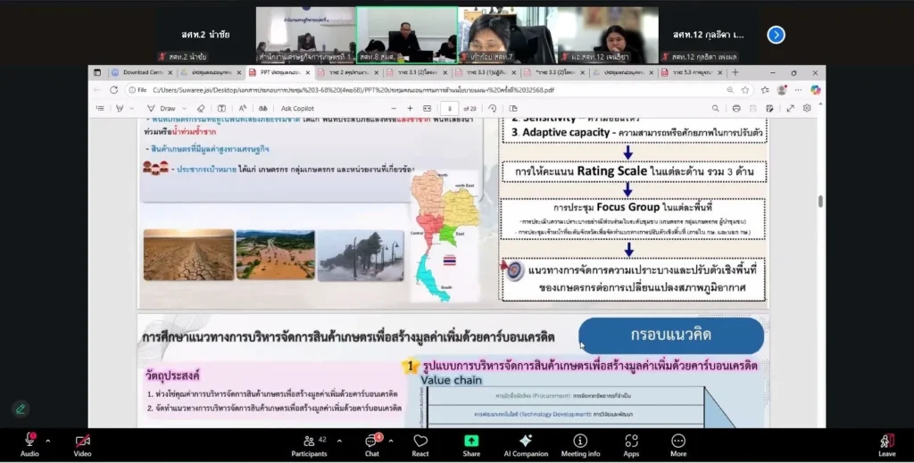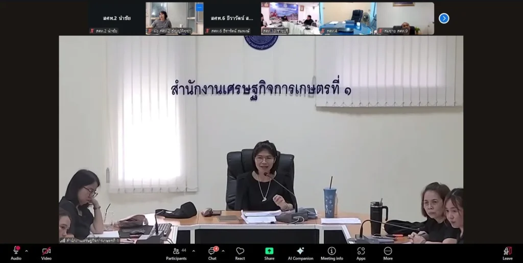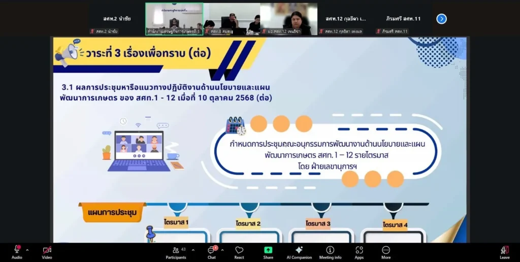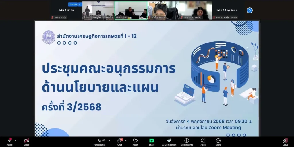 วันที่ 4 พฤศจิกายน 2568 นางธัญญ์พิชชา เถระรัชชานนท์ ผู้อำนวยการสำนักงานเศรษฐกิจการเกษตรที่ 2 (ผอ.สศท.2) พร้อมด้วย นางสุธาทิพย์ ศรีสรรพกิจ ผู้อำนวยการส่วนแผนพัฒนาเขตเศรษฐกิจการเกษตร เข้าร่วมประชุมคณะอนุกรรมการพัฒนางานด้านนโยบายและแผนพัฒนาการเกษตร สศท.1-12 ครั้งที่ 3/2568 ผ่านระบบออนไลน์ Zoom โดยมี นางสุจารีย์ พิชา ผู้อำนวยการสำนักงานเศรษฐกิจการเกษตรที่ 1 เป็นประธาน