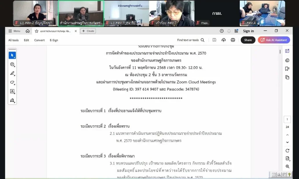 วันที่ 11 พฤศจิกายน 2568 นางธัญญ์พิชชา เถระรัชชานนท์ ผู้อำนวยการสำนักงานเศรษฐกิจการเกษตรที่ 2 (ผอ.สศท.2) พร้อมด้วย นางสุธาทิพย์ ศรีสรรพกิจ ผู้อำนวยการส่วนแผนพัฒนาเขตเศรษฐกิจการเกษตร และนางสาวปานรดา ถาเรือน นักวิเคราะห์นโยบายและแผนชำนาญการพิเศษ รักษาการในตำแหน่งผู้อำนวยการส่วนสารสนเทศการเกษตร เข้าร่วมประชุมการจัดทำคำของบประมาณรายจ่ายประจำปีงบประมาณ พ.ศ.2570 ของสำนักงานเศรษฐกิจการเกษตร ผ่านระบบออนไลน์ Zoom โดยมี นายฉันทานนท์ วรรณเขจร เลขาธิการสำนักงานเศรษฐกิจการเกษตร เป็นประธาน