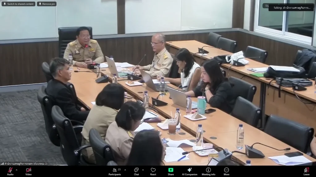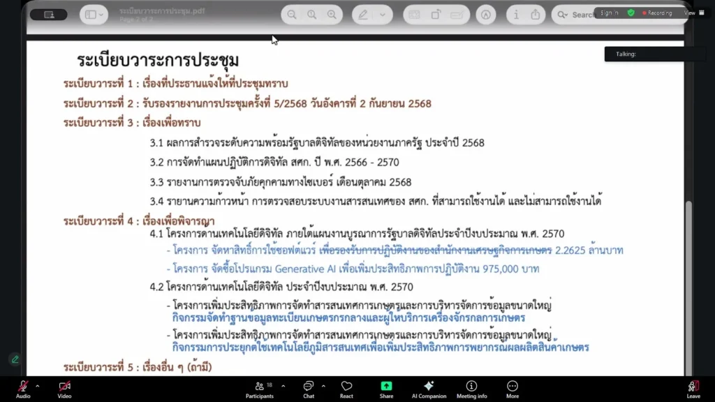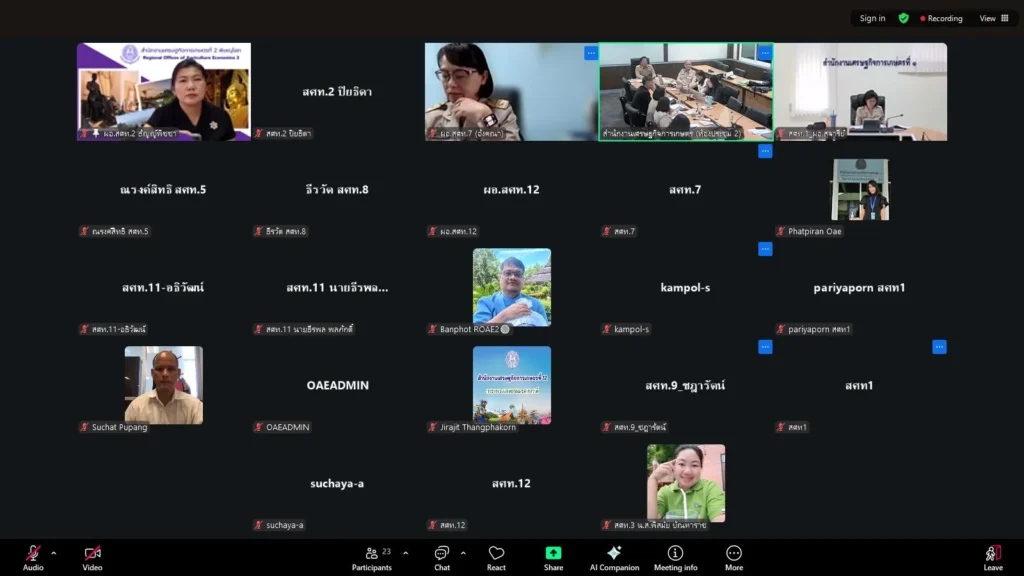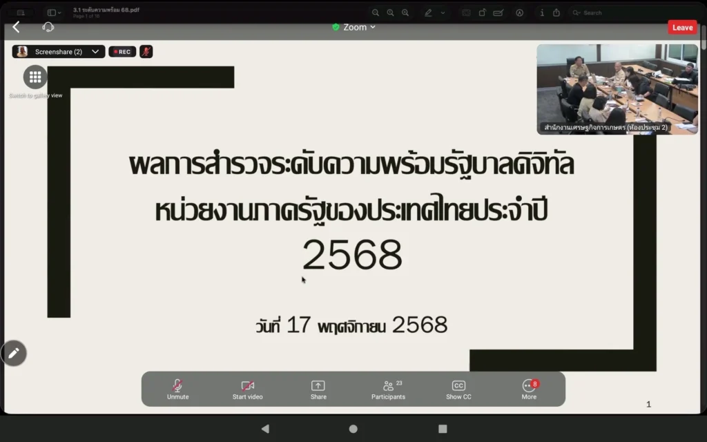 วันที่ 17 พฤศจิกายน 2568 นางธัญญ์พิชชา เถระรัชชานนท์ ผู้อำนวยการสำนักงานเศรษฐกิจการเกษตรที่ 2 (ผอ.สศท.2) พร้อมด้วย นายบรรพต นุชเลี้ยง นักวิชาการคอมพิวเตอร์ เข้าร่วมประชุมคณะกรรมการเทคโนโลยีสารสนเทศและการสื่อสารสํานักงานเศรษฐกิจการเกษตร ครั้งที่ 6/2568 ผ่านระบบออนไลน์ Zoom โดยมี นายกฤช เอี่ยมฐานนท์ ผูัอำนวยการศูนย์สารสนเทศการเกษตร เป็นประธานการประชุม